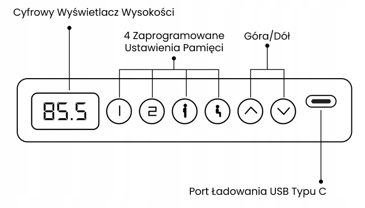 - Panel sterowania: wyświetlacz cyfrowy, port USB-C