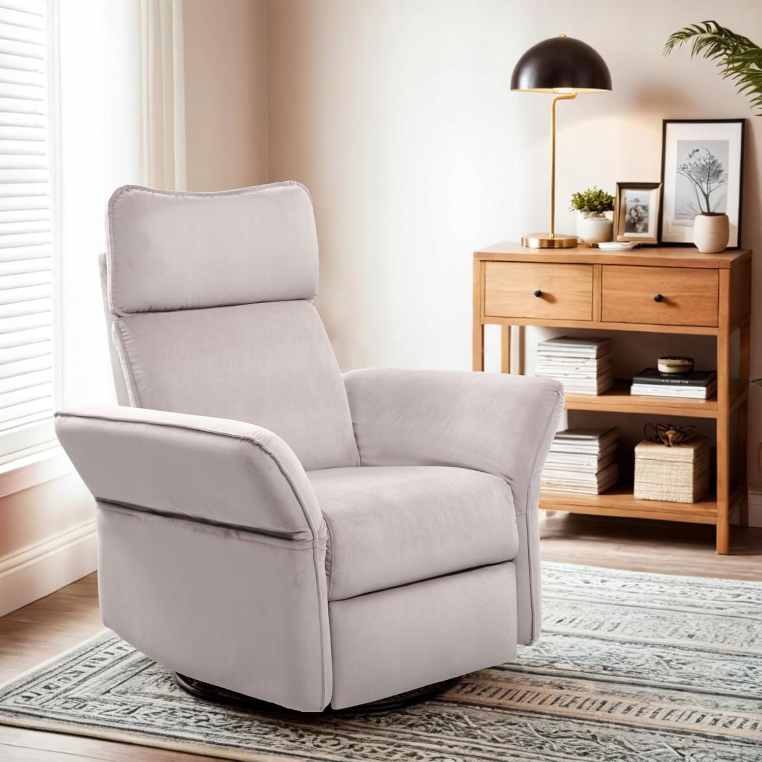 Nowoczesny fotel elektryczny, który łączy funkcję rozkładania, bujania i obrotu. Idealny do odpoczynku, czytania, drzemki i codziennego relaksu.