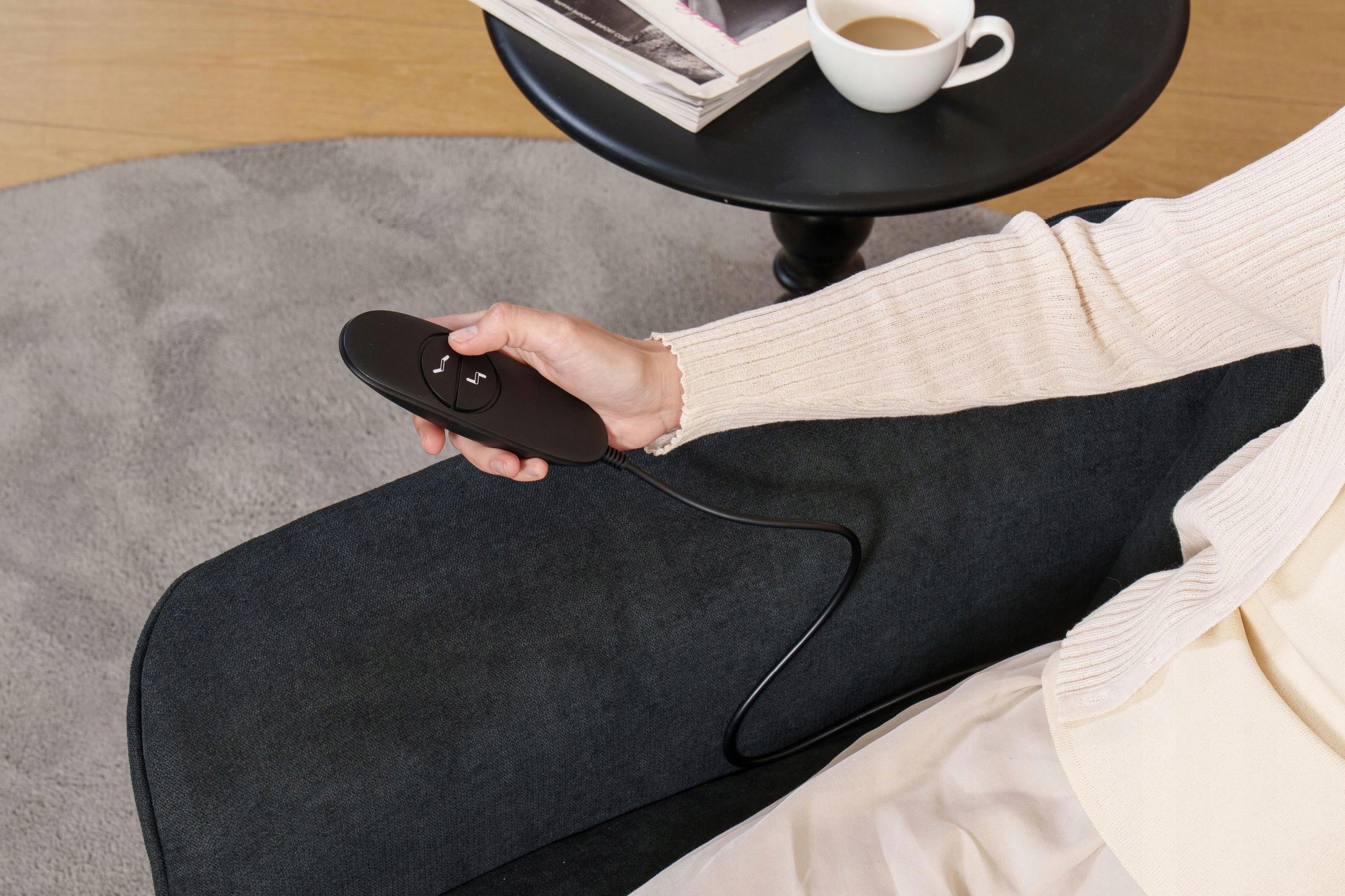 - Elektryczne sterowanie pilotem – płynna regulacja oparcia i podnóżka jednym przyciskiem