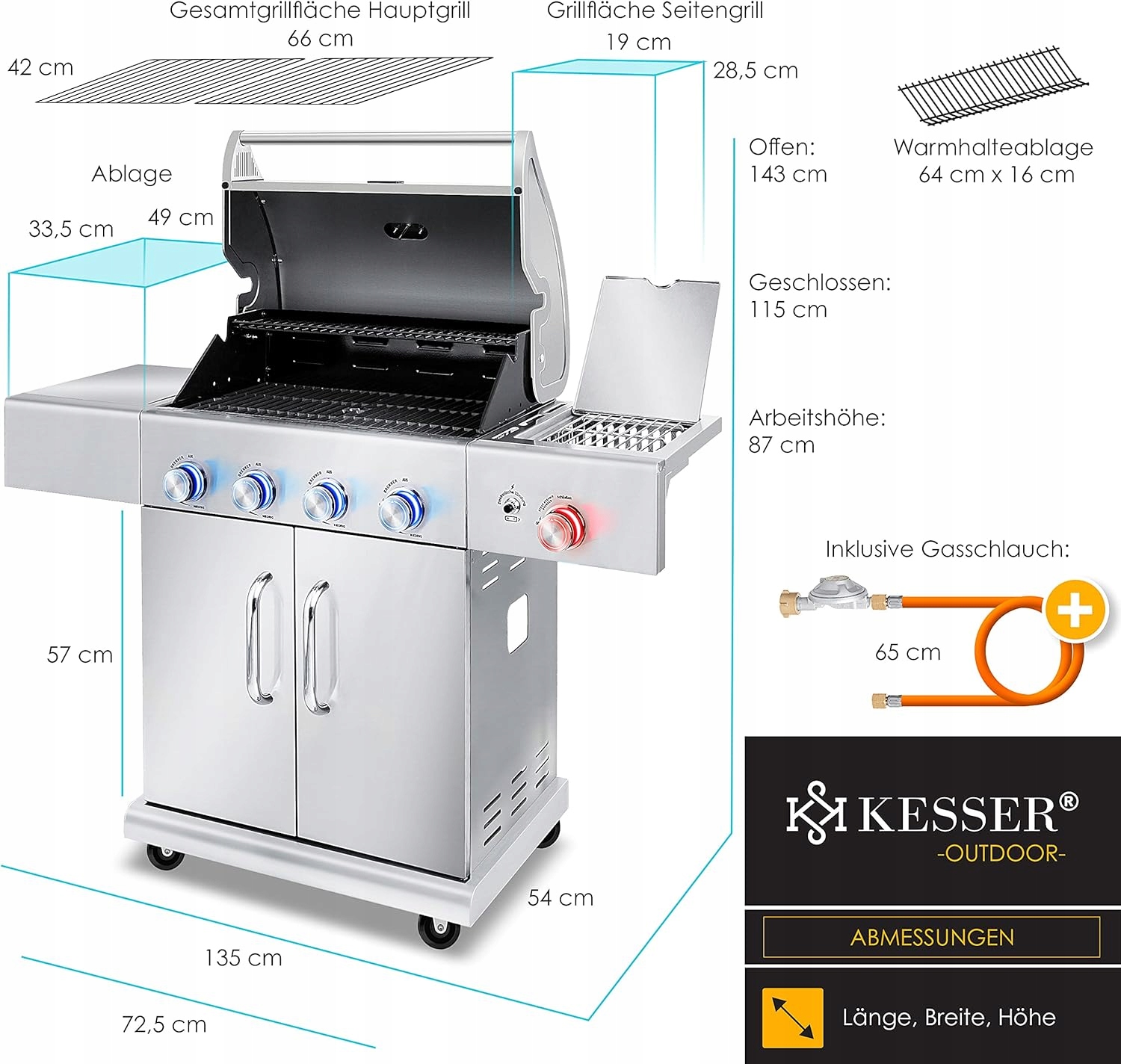 - Powierzchnia grillowania: 66 × 42 cm