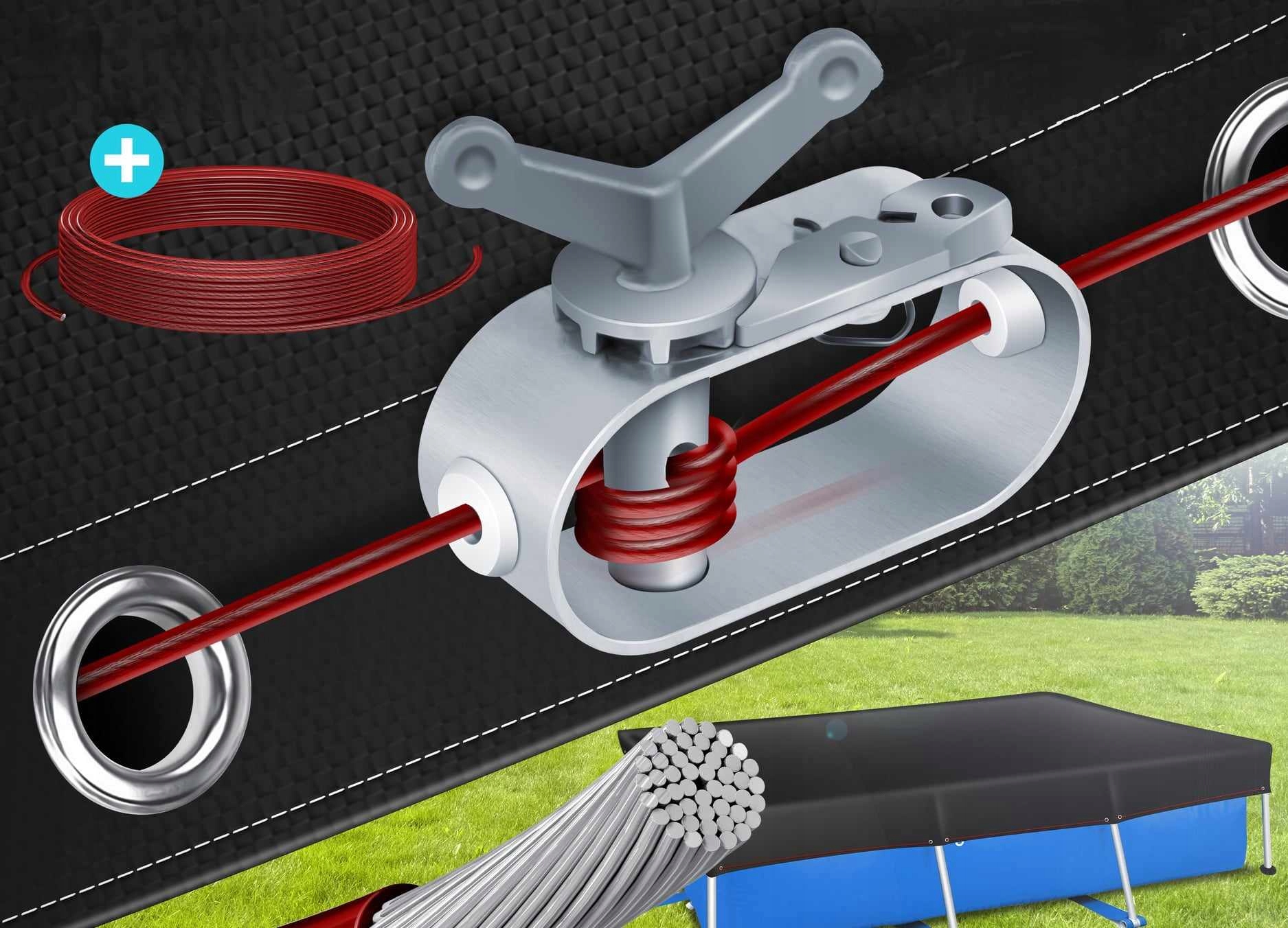 - Oczka z linką stalową i napinaczem w zestawie – łatwy montaż i stabilne naciągnięcie