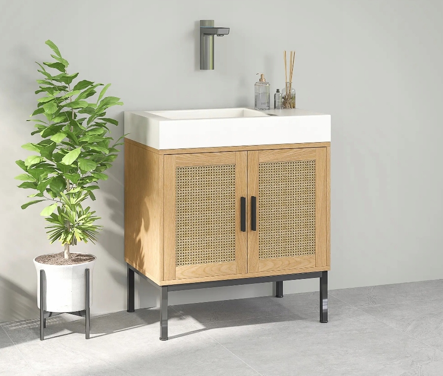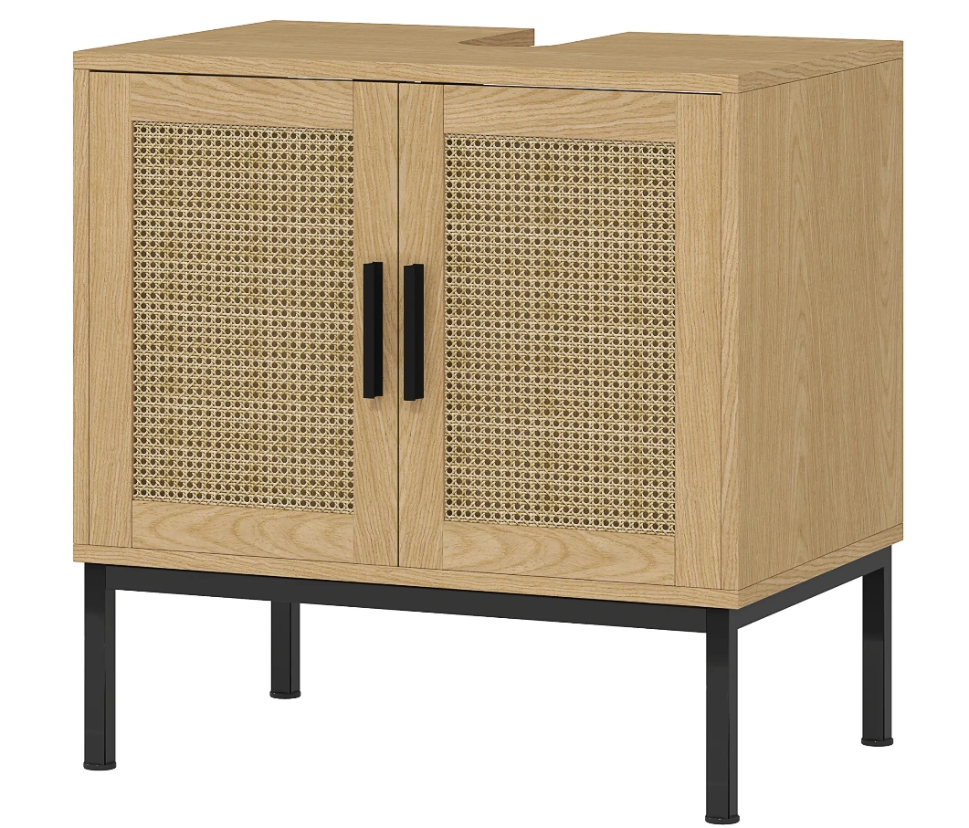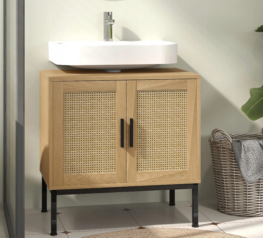 Szafka łazienkowa kleankin to idealne połączenie stylu boho i praktycznego przechowywania. Dzięki wycięciu na syfon świetnie sprawdzi się pod każdą standardową umywalką, dodając wnętrzu ciepłego, naturalnego charakteru.