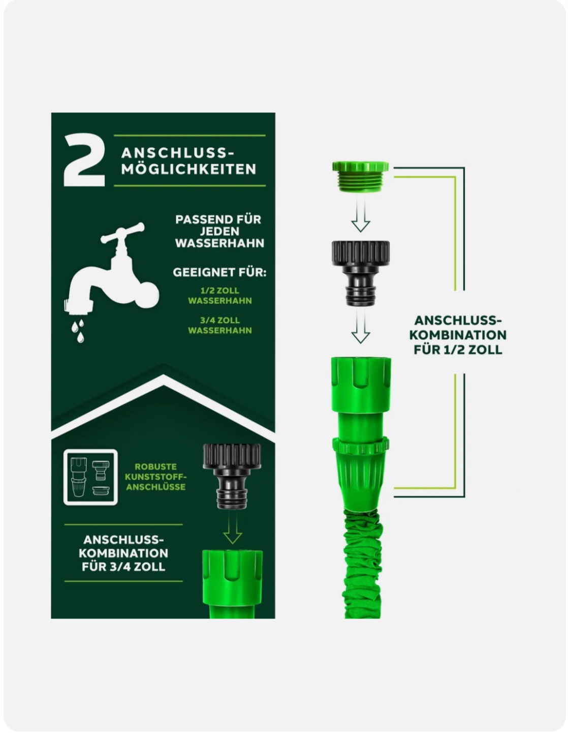- Uniwersalne złącza 1/2” i 3/4” – pasuje do większości kranów ogrodowych