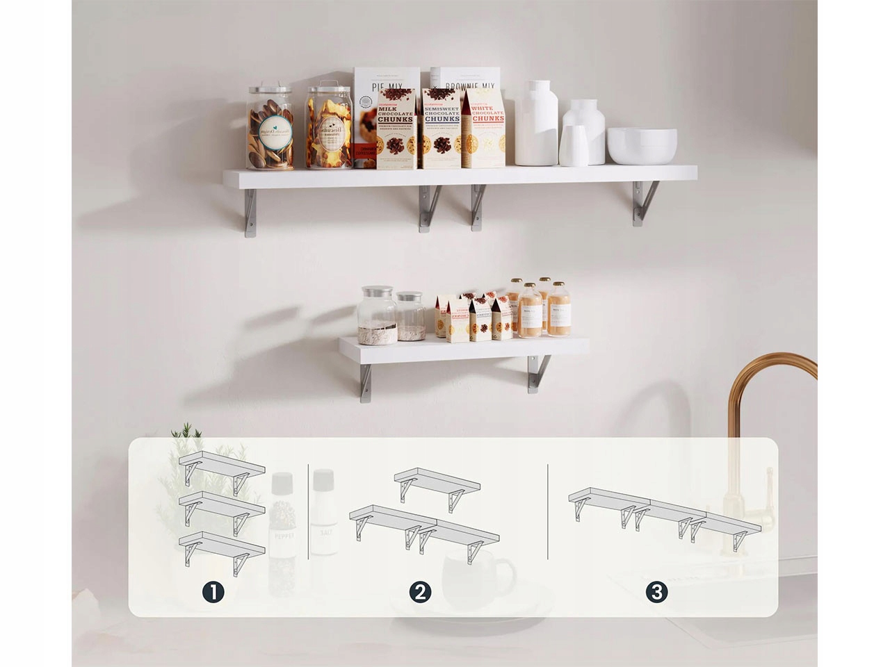 Nadaj ścianom stylu i funkcjonalności dzięki zestawowi trzech półek AW1W-3. To minimalistyczne, a zarazem eleganckie rozwiązanie do każdego pomieszczenia – salonu, sypialni, kuchni czy biura.